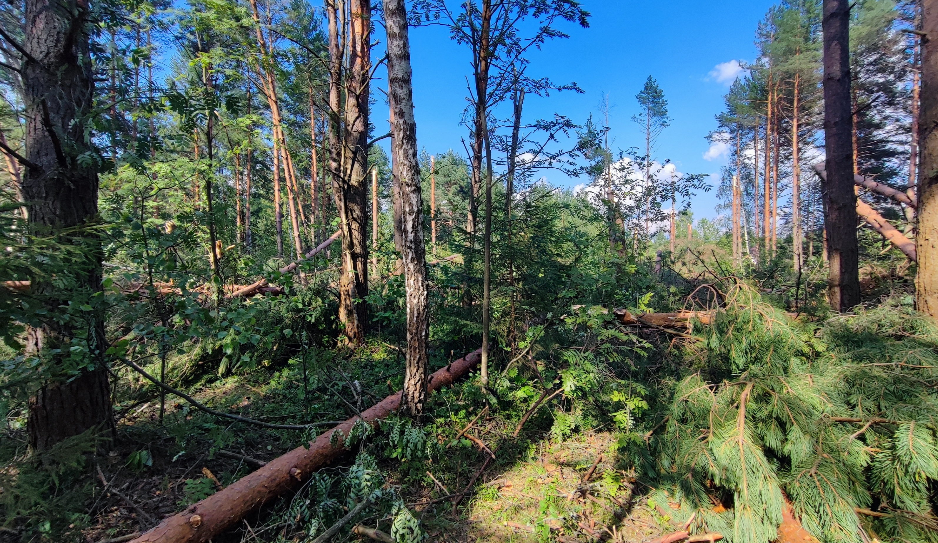 В Белавинском участковом лесничестве у садового товарищества «Радуга» продолжается разработка лесосеки после ветровала. Общая площадь – 11,4 гектара, из которых рубка проведена на 5,5 гектарах.