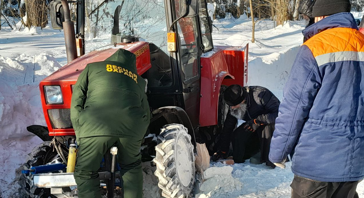 Расчищая дорогу к скиту, занесённую во время обильного снегопада, трактор служителей застрял в сугробе. Оказавшиеся неподалеку лесничие помогли вызволить уборочную технику.